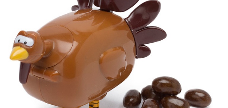 外面有成千上万这样的东西。请允许我们只提两个我们遇到过的陌生产品。首先是巴斯金-罗宾斯冰淇淋看起来像烤焦了的火鸡的点心和蛋糕.第二种是火鸡粪便糖果分配器。这只神奇的小鸟会排泄糖果,这是一个关于火鸡在被宰杀前受惊的表现的笑话。因为没有什么比让家里的孩子知道鸟在面对死亡时恐惧地排便.