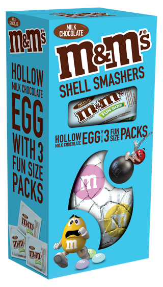 Mars Wrigley also is trying something completely new this year, based on the tradition in other countries of smashing candy eggs on Easter morning. Exclusively at Walmart, Mars Wrigley has made Shell Smashers — hollow chocolate eggs to smash, with M&Ms or mini Snickers or Twix bars inside.