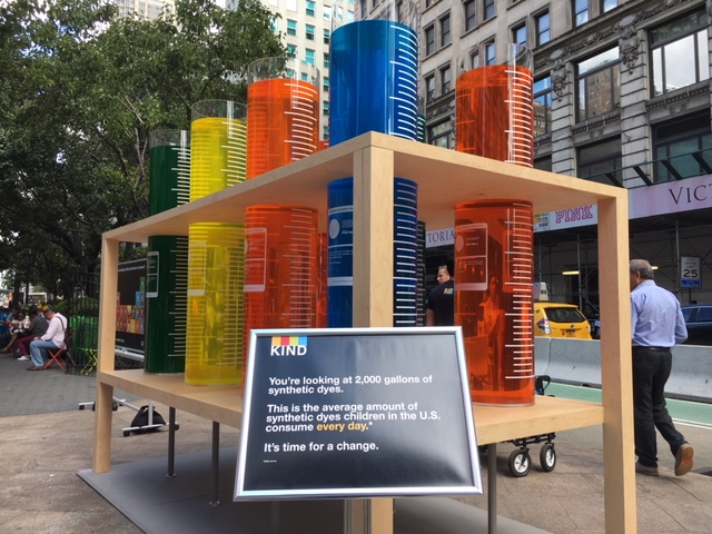 - 9月24日,种类在纽约市展示了大型测试管,其中包含2,000加仑的合成染料,这大约是所有美国儿童每天消费的数量。其中八种染料已获得美国食品药品监督管理局的批准用于食品和饮料。Kind说,它们是在各种类型的食物中发现的,包括冷冻早餐,糖果,微波爆米花,泡菜,水果杯,薯条和水果小吃。
