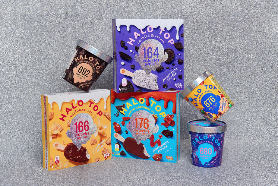 Halo Top正试图通过它的冰淇淋品种都非常优质在英国销售的Halo Top的白金系列巧克力棒和品脱的特色是有旋涡的味道和大块的蛋糕、糖果和饼干,但比许多品牌的糖和卡路里更少。