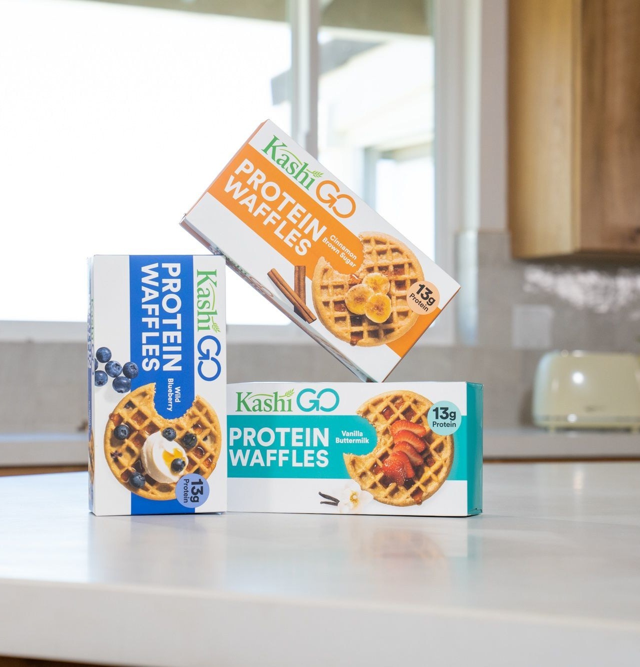 Kashi GO推出了三种口味的冷冻蛋白华夫饼:野蓝莓、肉桂红糖和香草酪乳。这种新的华夫饼将在全国各地的零售商有售。