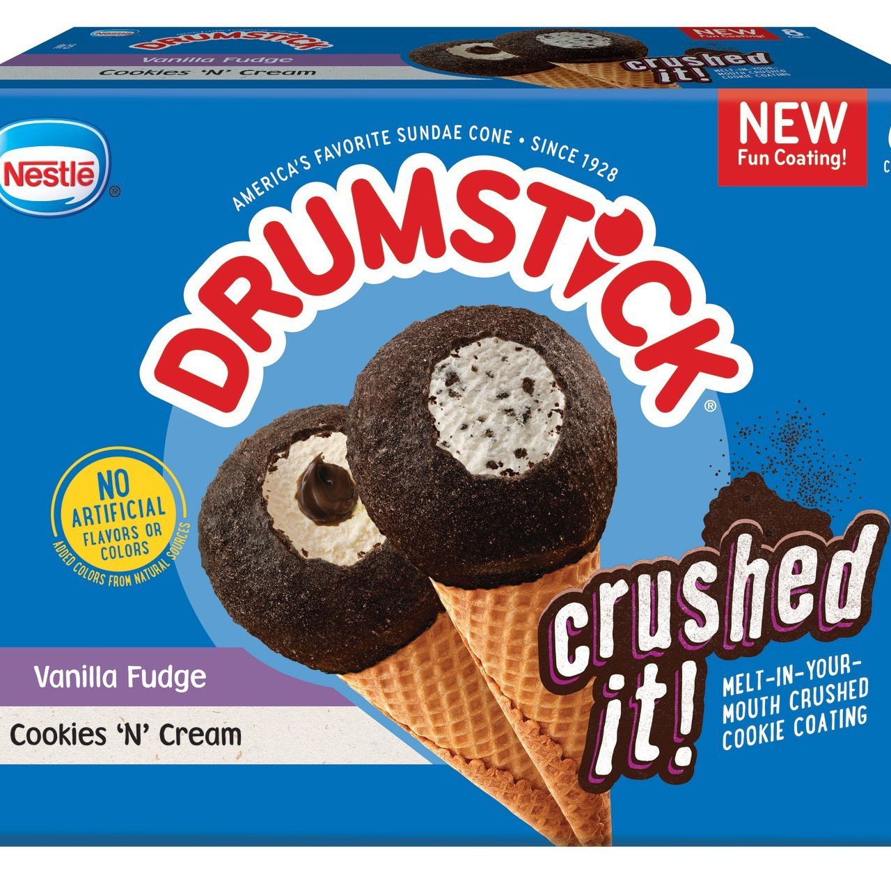 "The Drumstick brand is constantly pushing the envelope when it comes to innovation, from our unique coatings, flavors and textures to our product formats," Joanna Komvopoulos, Drumstick brand manager,said in a press release. "Knowing that Cookies 'N' Cream is a favorite flavor for so many Americans and a staple in sundae shops around the world, we developed Drumstick Crushed It! and doubled down on the experience by amplifying the melt-in-your-mouth cookie coating with our new Cookies 'N' Cream and Vanilla Fudge flavors."