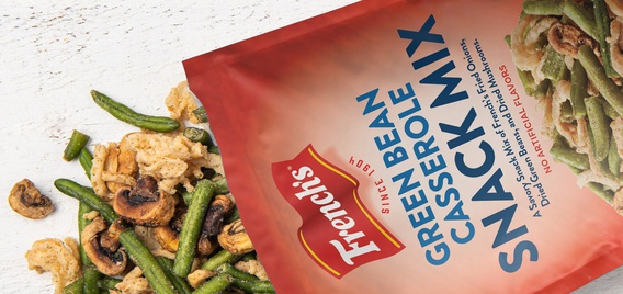 麦考密克的法语品牌正在推出青豆砂锅小吃组合以便携的方式复制感恩节餐桌上的主食。这种混合物的特点是冷冻干燥的青豆和蘑菇,香料、洋葱和酸奶油,当然还有的法式炸洋葱,通常放在菜的顶端。