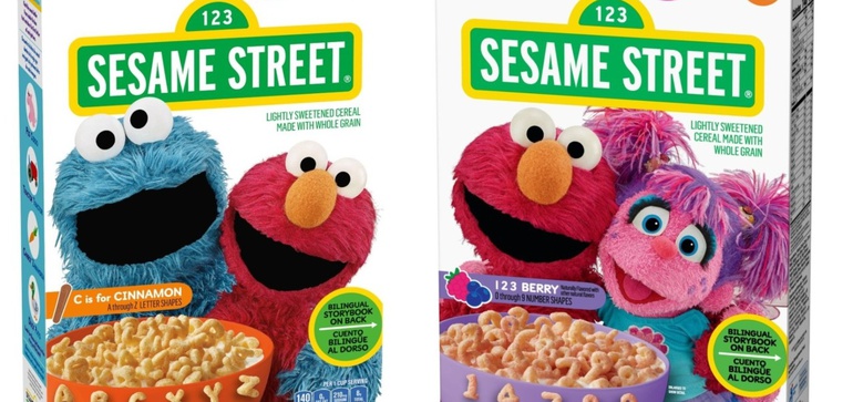 芝麻街麦片这些盒子上印有这部已有51年历史的教育电视节目中的角色,将于下个月上架。它有两种口味:一种是浆果口味的麦片,带有数字形状的小块;另一种是肉桂口味的麦片,带有字母形状的小块。