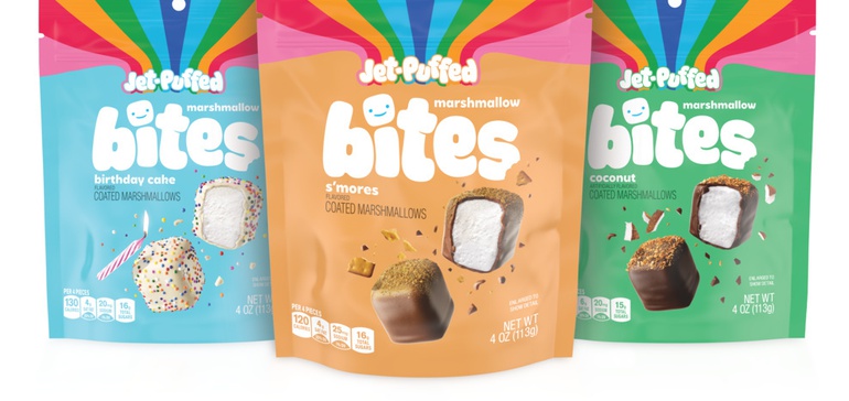 牛皮纸的棉花糖品牌的改造将白色空气膨化气瓶从成分转变s ' mores,热可可和谷物棒成为一种美味的小吃。jet - puff的新产品Bites系列采用了该品牌经典的棉花糖涂层,糖果和可食用的装饰,让它们看起来更颓废。