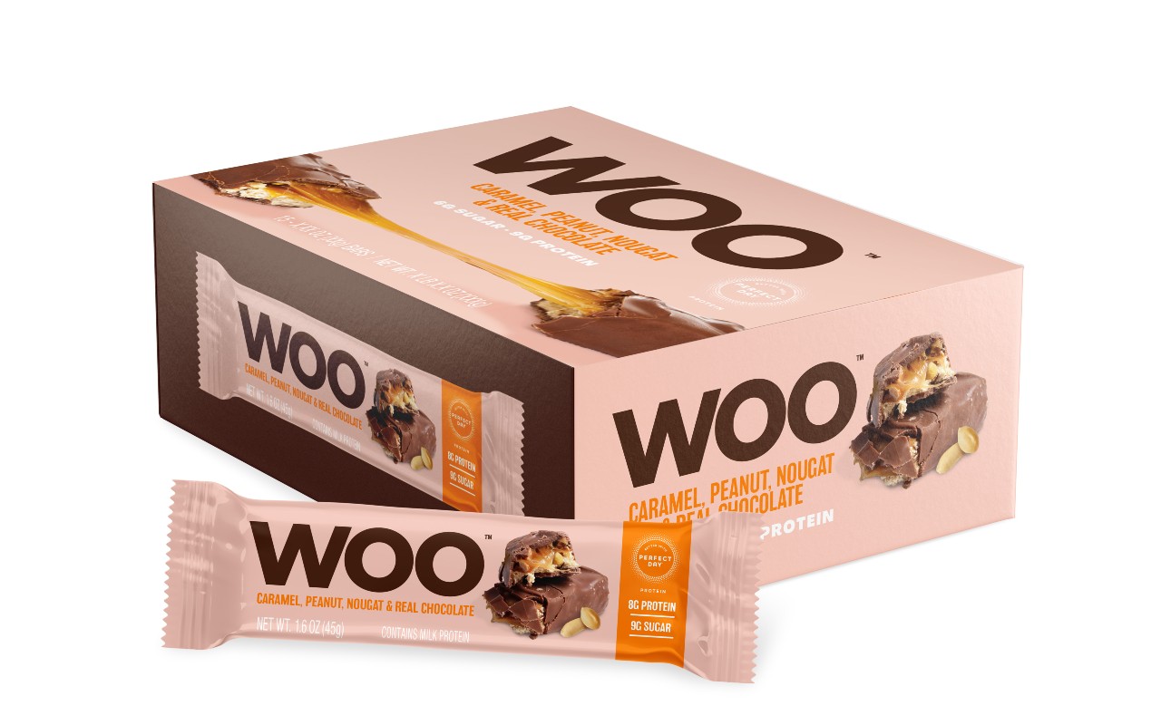 Betterland Foods, a company that launched in February with由完美的乳制品蛋白制成的无动物牛奶,,,,just debuted its Woo line of chocolate candy. Woo bars do have dairy, but none of it comes from animals. The Woo layered bar, now available to order online, has organic chocolate, caramel, peanuts and nougat.