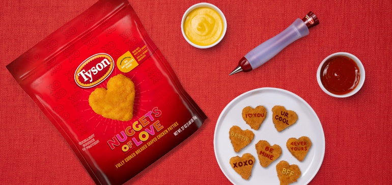 这家阿肯色州肉类和家禽加工巨头正在出售心形的鸡肉,叫做“爱的鸡块”在有限的时间内。为了帮助人们用金块来表达“我爱你”,泰森还向消费者提供了一个赢得像钢笔一样工作的酱笔的机会。蘸上自己喜欢的蘸酱,手写笔就能写下爱的讯息。