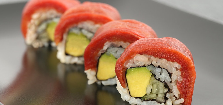 海洋极端派的食物他们花了五年时间研发出一种专有方法,用罗马番茄制作出令人信服的生金枪鱼。其结果就是“Ahimi”,可以用来做寿司卷,也可以用来做手握寿司的人造鱼片。据《华尔街日报》,一些天然食品商店出售的产品是和100年在使用餐厅和自助餐厅在美国下一个公司是一个模仿鳗鱼产品由茄子称为“Unami”和人造鲑鱼制成胡萝卜称为“Sakimi。”