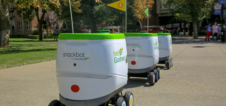 - 学生们可以在早上9点到下午5点之间,使用snackbot应用程序订购零食,送到校园内50多个指定的外卖点。三到五个外卖机器人可以送达,它们配备了摄像头和车灯,可以在恶劣天气中导航操作一次。每个机器人充电一次可以行驶20英里。